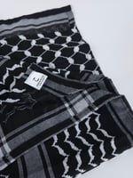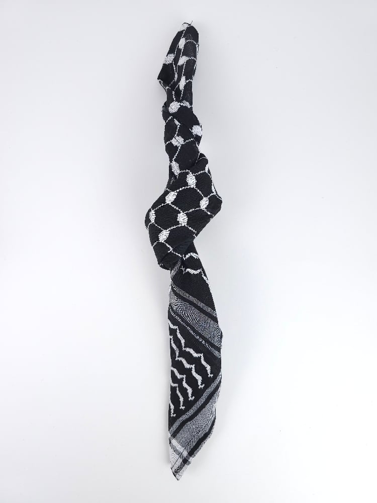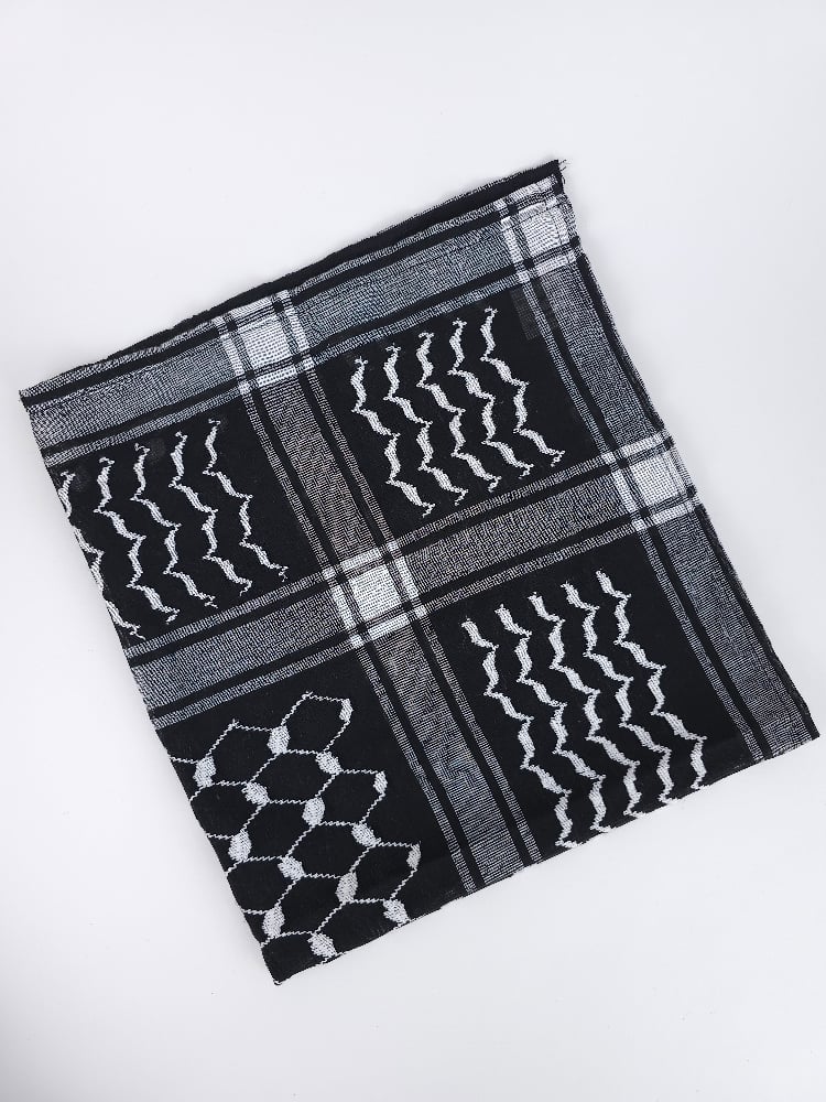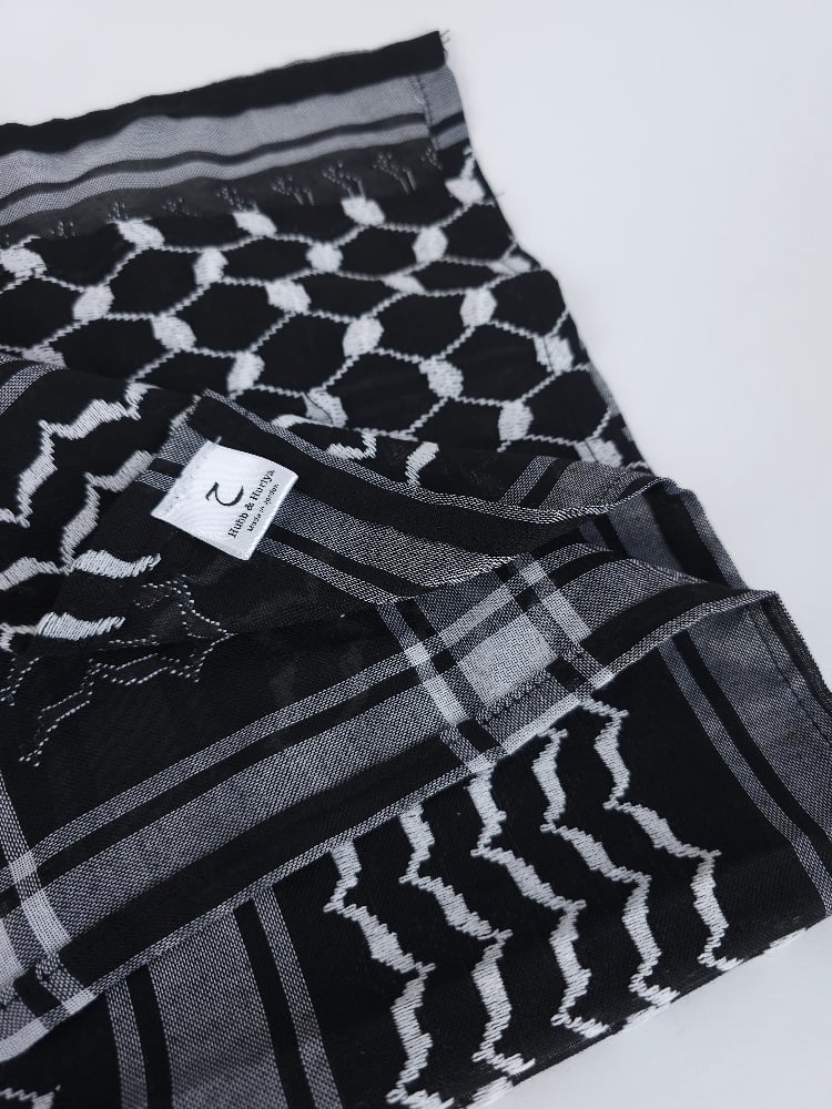 A meaningful way to show your solidarity with Palestine. Crafted with purpose, it is made from authentically woven keffiyeh fabric. The bold lines reflect Palestine’s rich history of trade and cultural exchange, the olive leaves symbolize resilience and perseverance, and the fishnet pattern connects Palestinian fishermen to the Mediterranean Sea.