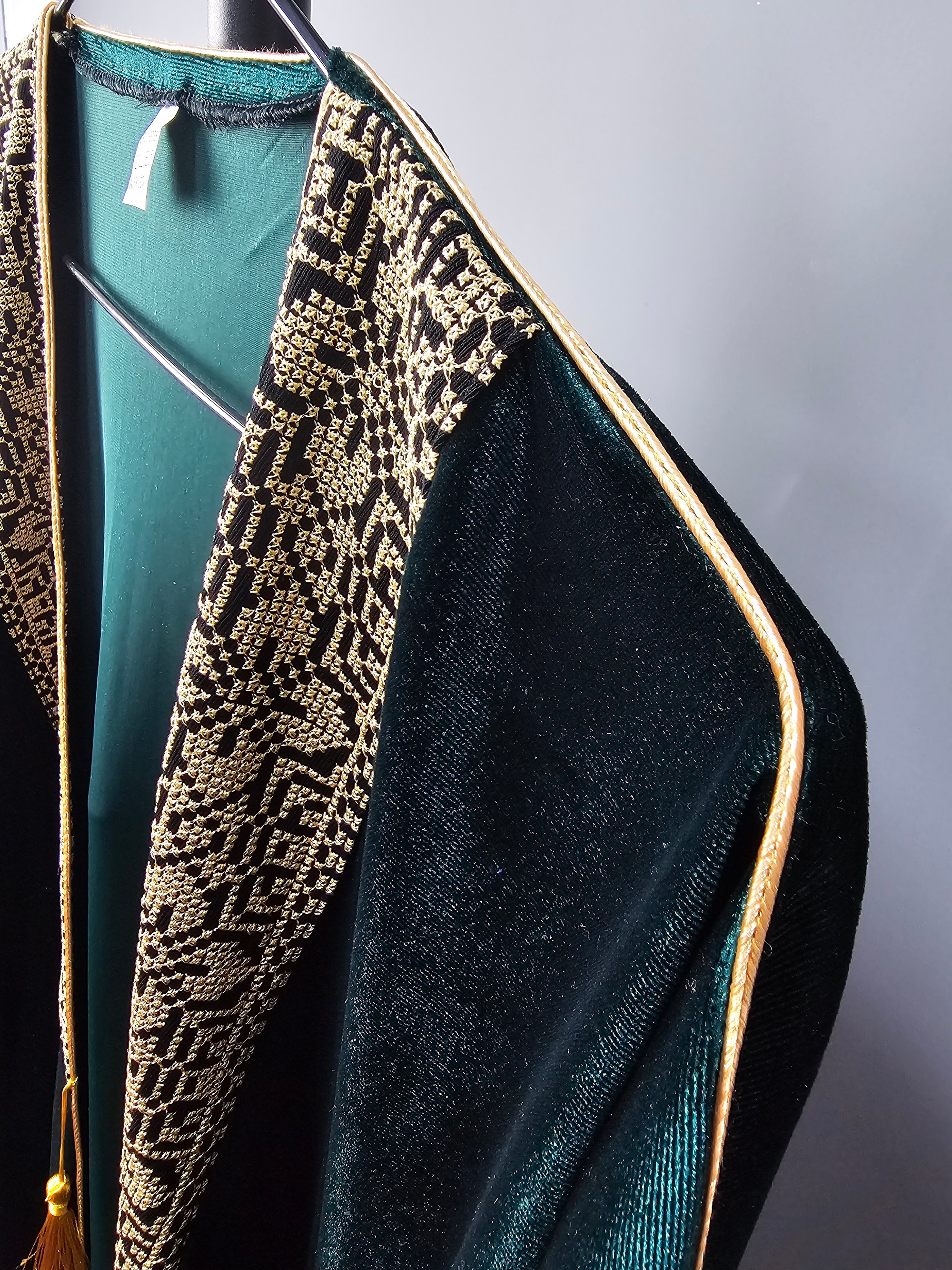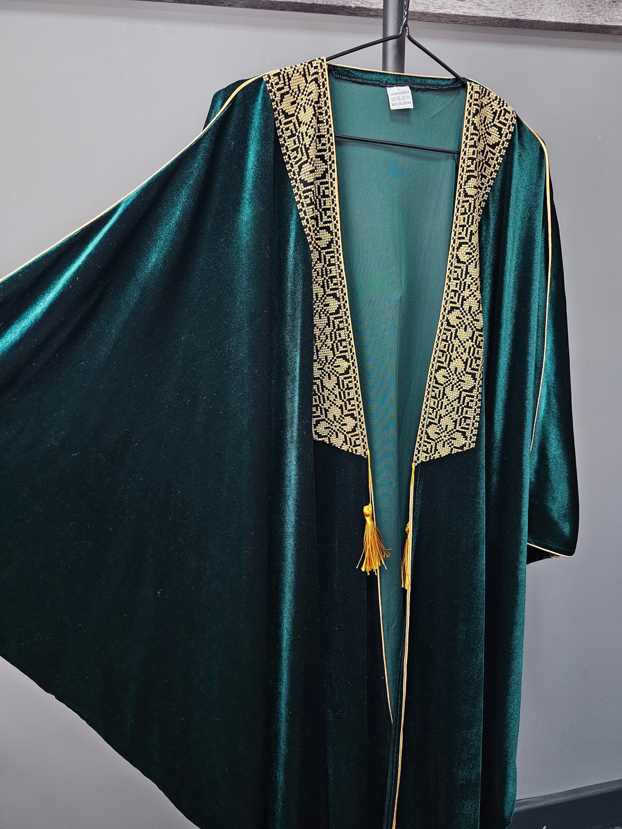 This luxurious Velvet Abaya, inspired by Palestinian Tatreeze on its border and in the style of a Arabian Abaya.